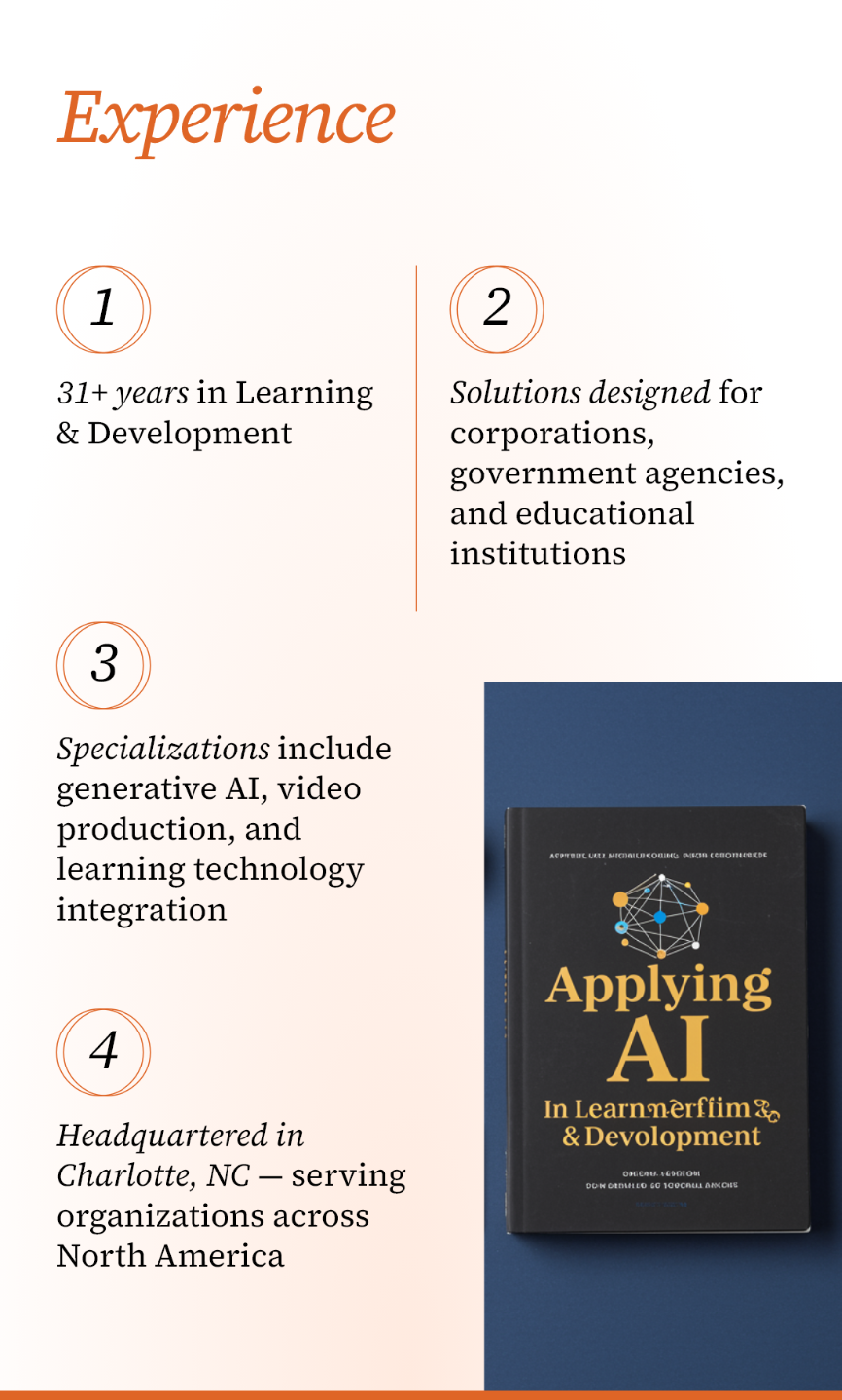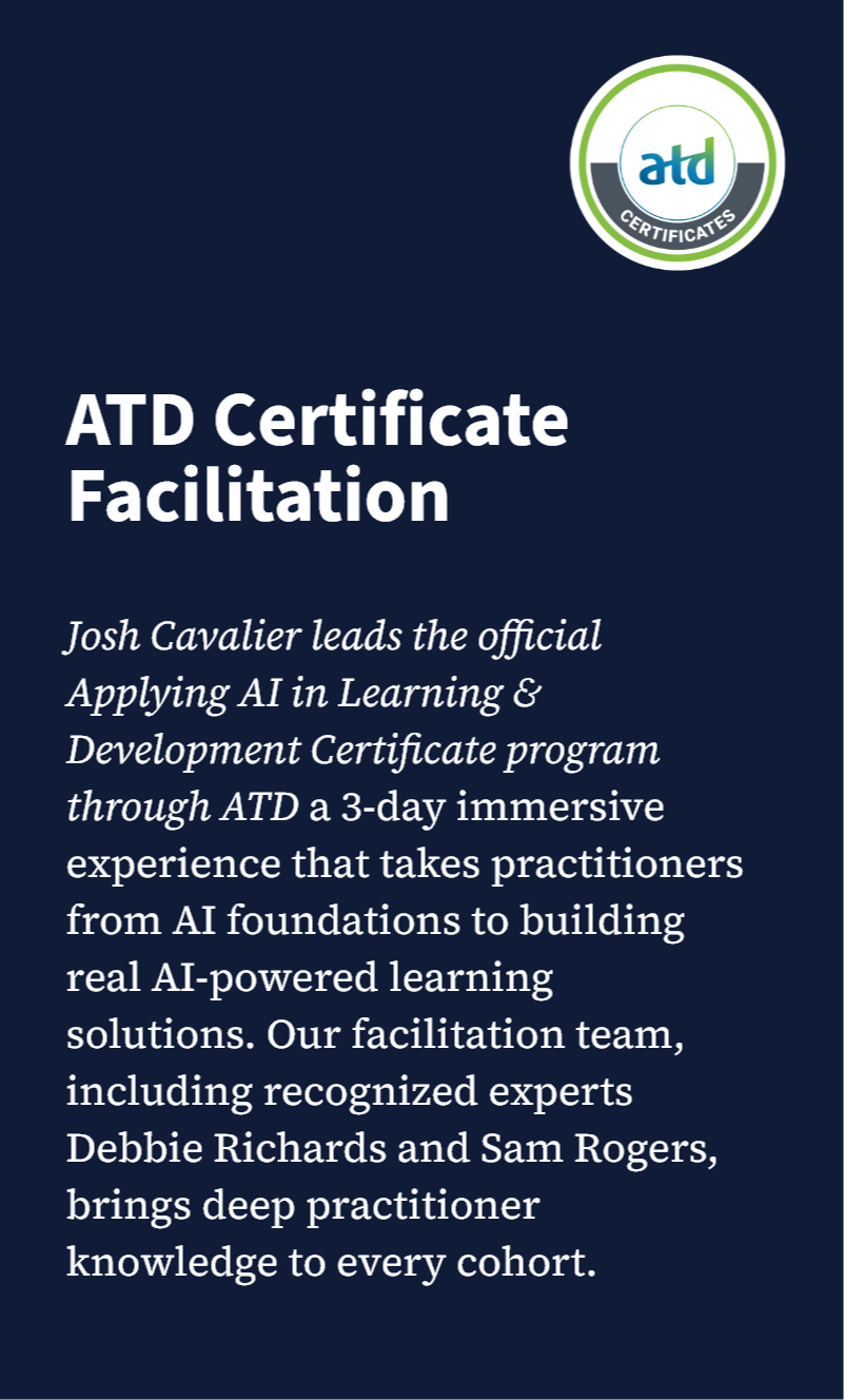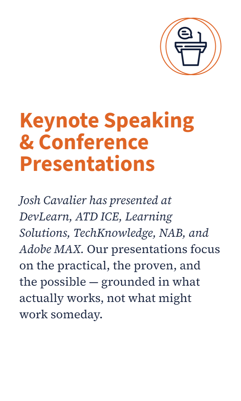 Our Founder & Chief Learning Strategist, Josh Cavalier, has designed learning solutions for Fortune 500 companies. He’s built training programs for government agencies. He’s sat in the meetings where leadership wanted “something innovative” but couldn’t define what that meant. Our team has navigated every technology shift this profession has seen — from CD-ROMs to LMS platforms to mobile learning to video to, now, generative AI.