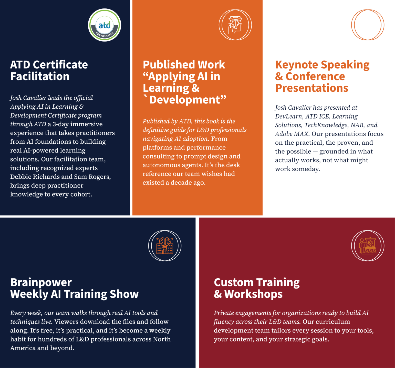 JoshCavalier.ai was founded by Josh Cavalier, a veteran learning strategist with three decades of experience building learning solutions for corporations, government agencies, and educational institutions. Today, our team helps L&D professionals transform from content creators into Human-Machine Performance Analysts™.